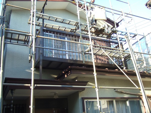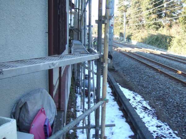 敷地いっぱいに建物が建っていますので、隣地の鉄道側の承諾を得て足場を架けています。